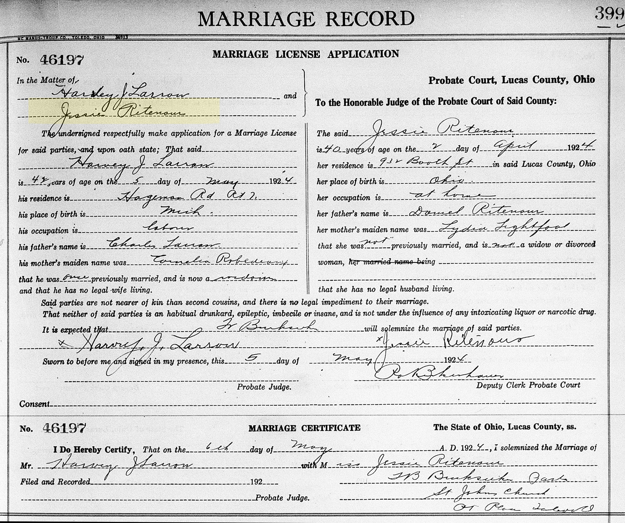 1 "Ohio, County Marriages, 1789-2016," database with images, FamilySearch.org (accessed 31 August 2020); Harvey J Larrow and Jessie Ritenour, 06 May 1924; citing Marriage, Lucas, Ohio, United States, Franklin County Genealogical & Historical Society, Columbus; FHL microfilm.