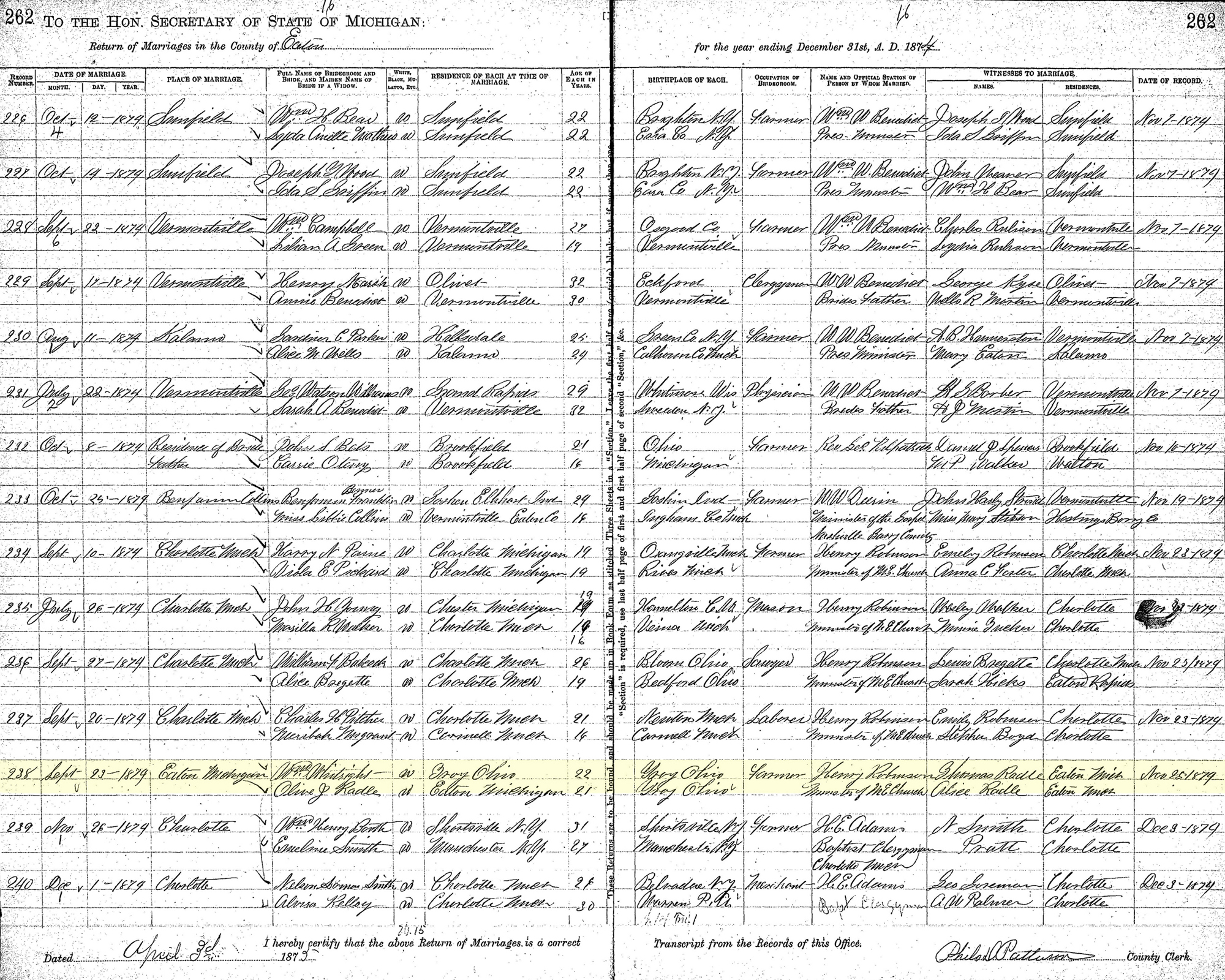 1 "Michigan Marriages, 1868-1925," database with images, FamilySearch (accessed 27 April 2021), (https://www.familysearch.org/ark:/61903/1:1:NQWY-GMP : 27 April 2021), Wm. Whilwright and Olive J. Radle, 23 Sep 1874; citing Marriage, Eaton, Eaton, Michigan, Citing Secretary of State, Department of Vital Records, Lansing; FHL microfilm 4207572.
