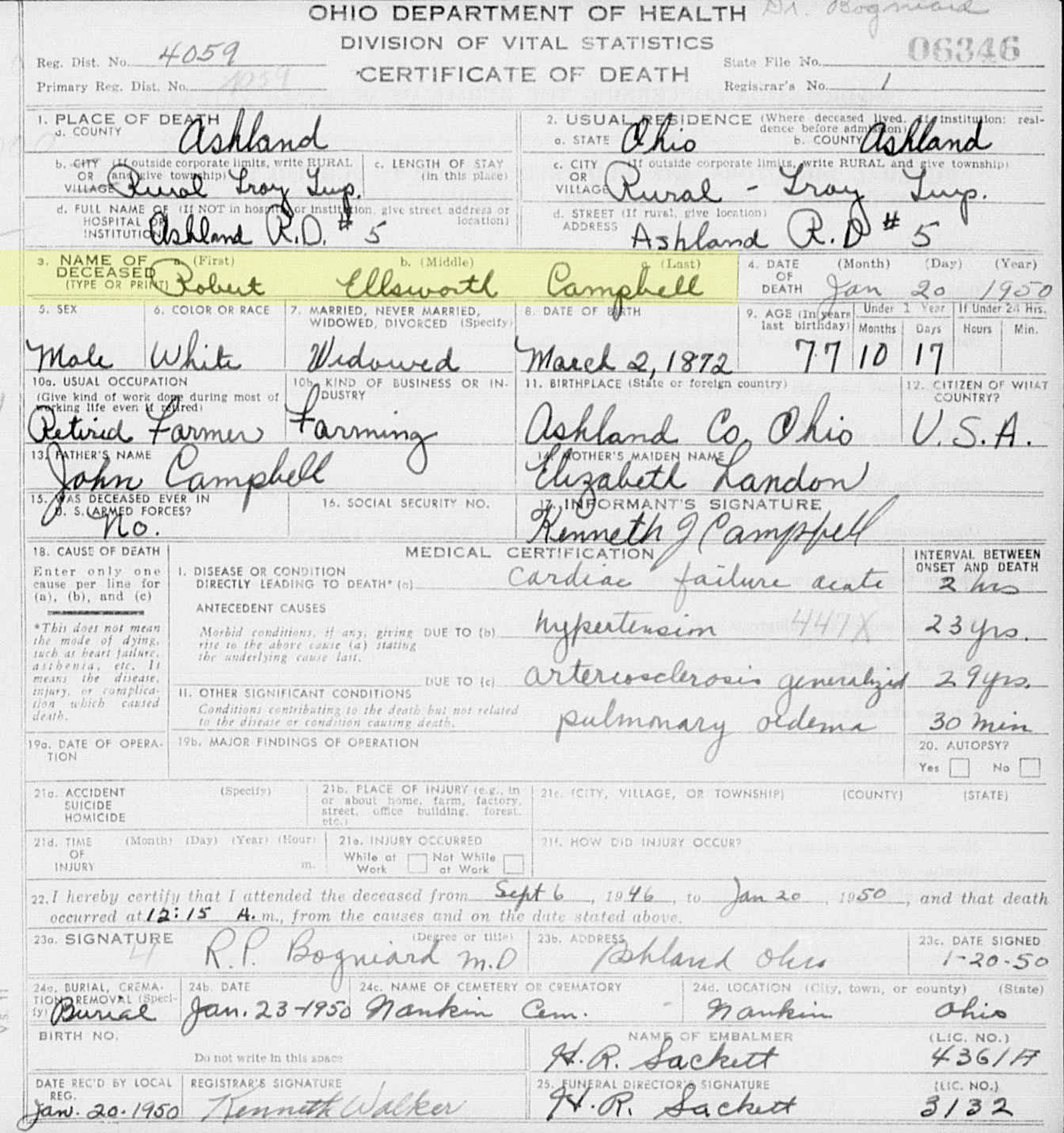 8 "Ohio Deaths, 1908-1953," database with images, FamilySearch.org (accessed 2 May 2021), (https://www.familysearch.org/ark:/61903/1:1:X6RV-ZY5 : 8 March 2021), Robert Ellsworth Campbell, 20 Jan 1950; citing, reference Certificate; FHL microfilm 2,372,553.