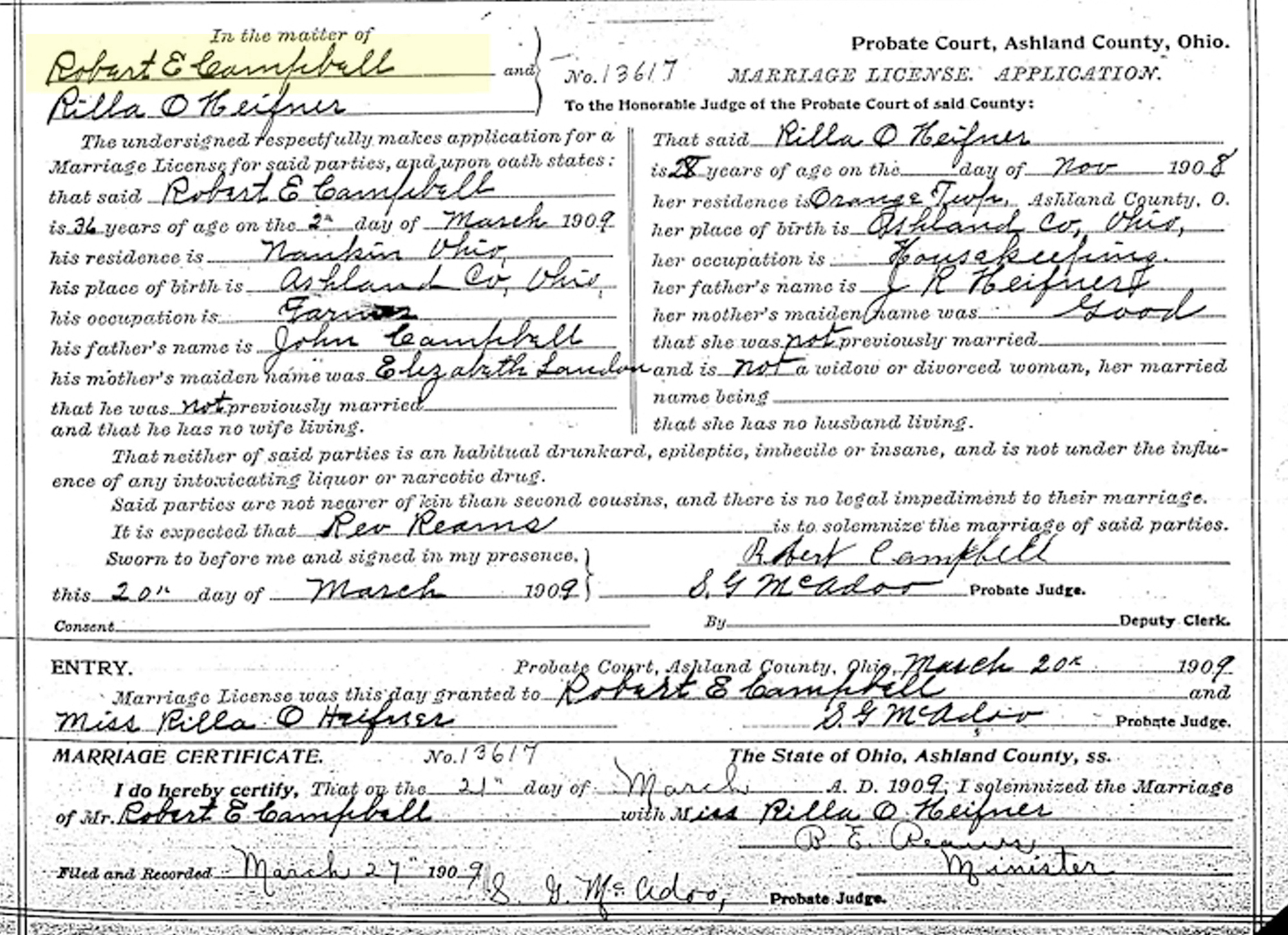 1 "Ohio, County Marriages, 1789-2016," database with images, FamilySearch.org (accessed 1 May 2021); (https://www.familysearch.org/ark:/61903/1:1:Z8QQ-1K2M : 8 March 2021), Robert E. Campbell and Rilla O. Heifner, 1909.