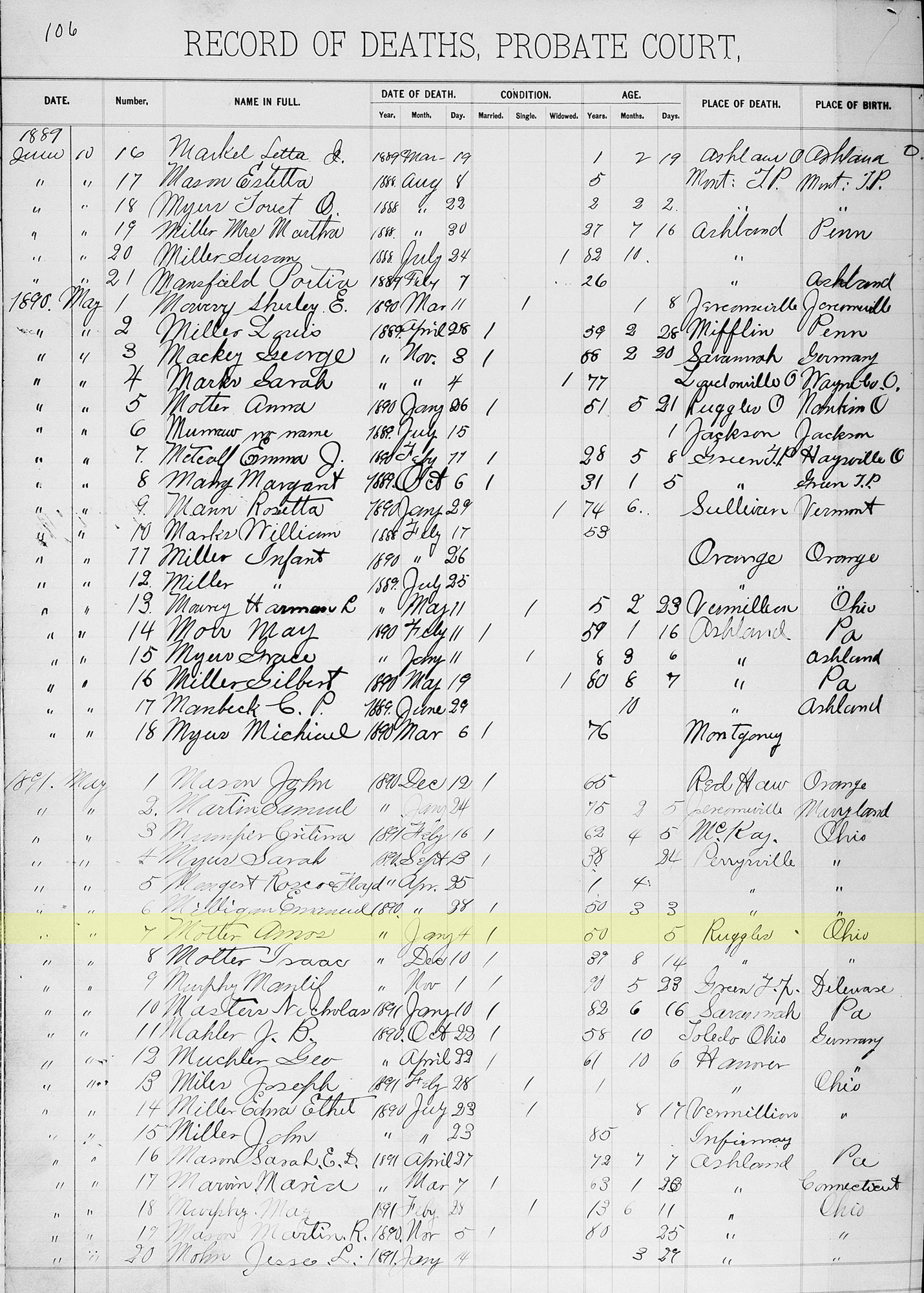 • Death Image: 4 January 1890, in Ruggles Township, Ashland County, OH. 4