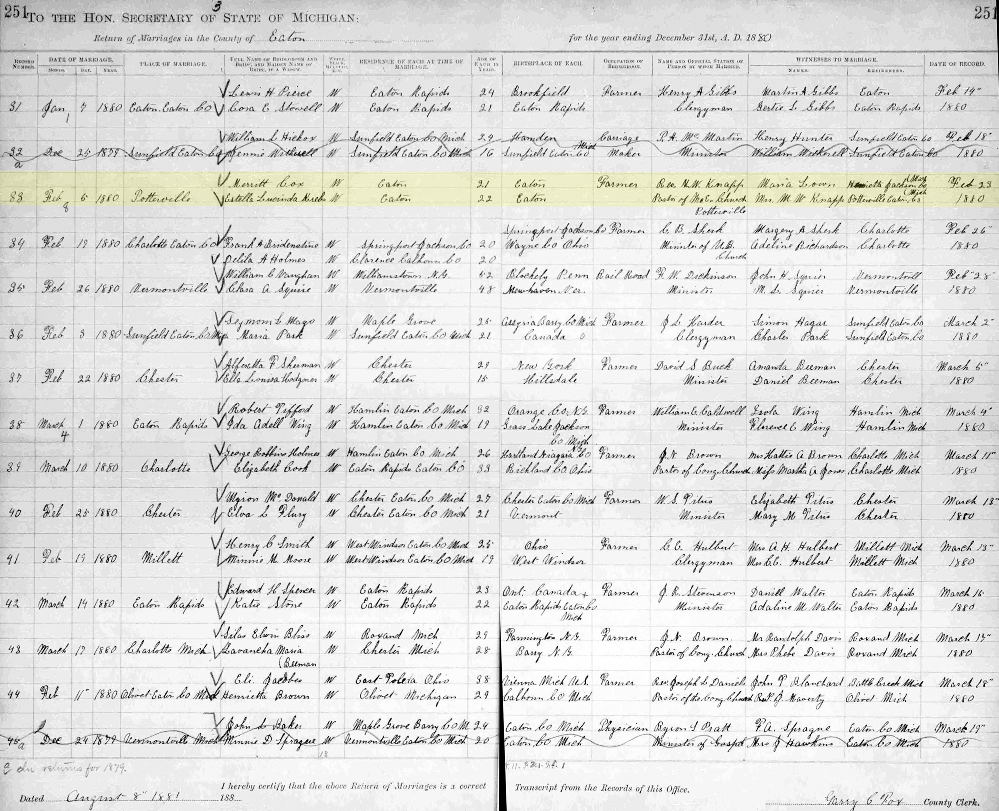 1 "Michigan Marriages, 1868-1925," database with images, FamilySearch (accessed 13 May 2021), (https://familysearch.org/ark:/61903/1:1:N36F-J82 : 18 February 2021), Merritt Cox and Estella Lucinda Kreb, 5 Feb 1880; citing Marriage, Potterville, Eaton, Michigan, Citing Secretary of State, Department of Vital Records, Lansing; FHL microfilm 4207610.