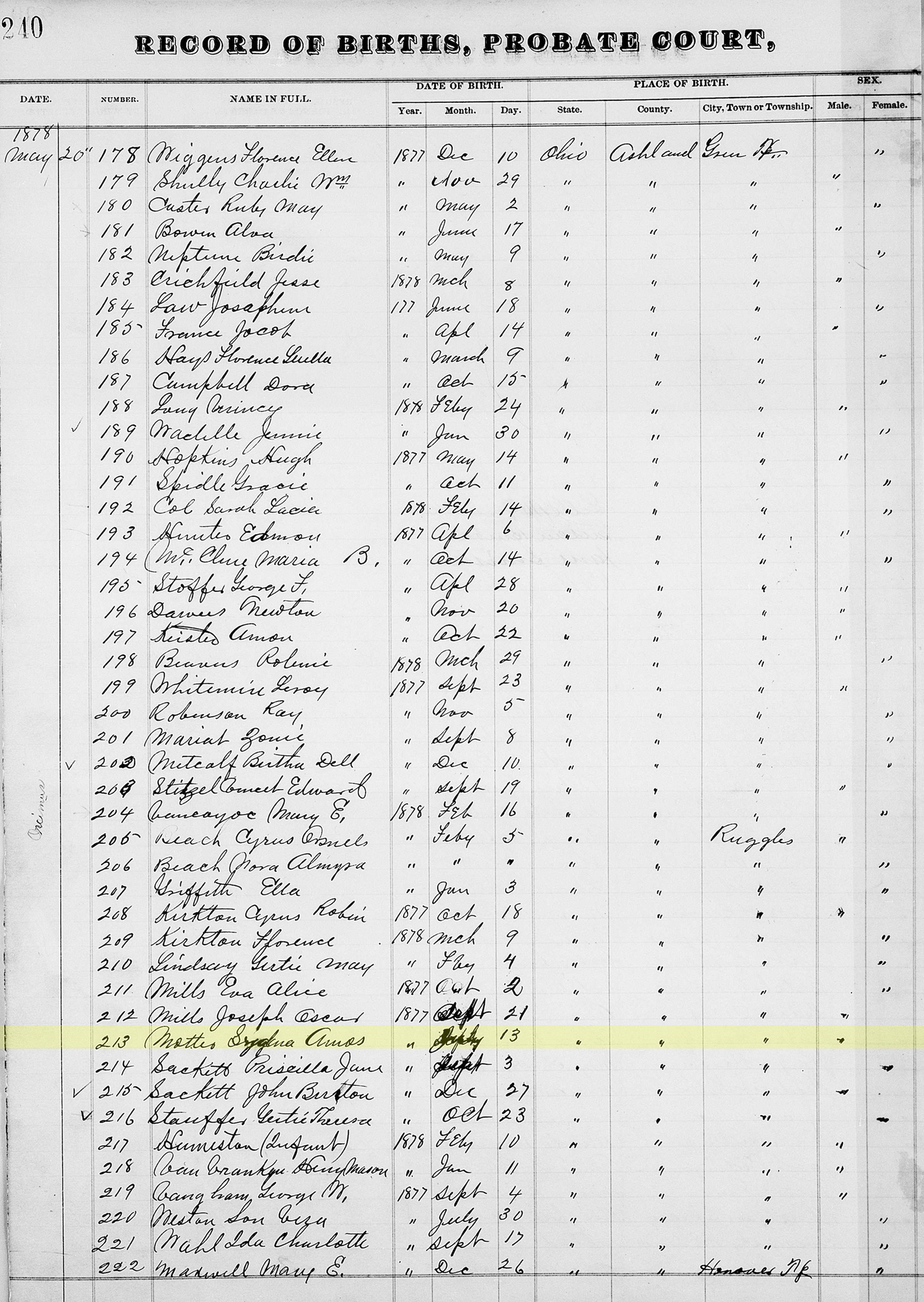 6 "Ohio Births and Christenings, 1821-1962," database, FamilySearch (https://familysearch.org/search/collection/1680845 : accessed 19 May 2021), (https://familysearch.org/ark:/61903/1:1:XD1R-6ZB : 19 January 2020), S...na Amos Mottes, 1877.