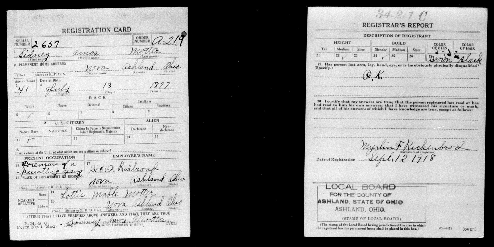 • Birth Image: 13 July 1877, in Ruggles Township, Ashland County, OH. 6 • He has alternate birth date of 13 September 1877 and a birth location of Ruggles Township, Ashland County, OH. • He appeared on the 1880 US Census in Ruggles Township, Ashland County, OH on 9 June 1880. 8 • He appeared on the 1900 US Census in Ruggles Township, Ashland County, OH on 25 June 1900. 2 • He appeared on the 1910 US Census in Troy Township, Ashland County, OH on 5 May 1910. 3 • His occupation on 12 September 1918 was a Foreman of Painting Gang for B&O Railroad in Nova, OH. 7 • He resided in Nova, OH on 12 September 1918.