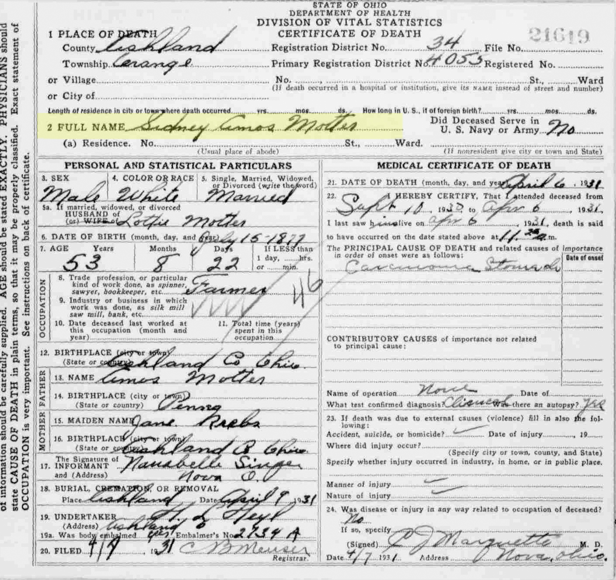 9 "Ohio Deaths, 1908-1953," database with images, FamilySearch.org (accessed 20 May 2021), (https://www.familysearch.org/ark:/61903/1:1:XD16-66M : 19 May 2021), Sidney Amos Motter, 06 Apr 1931; citing Orange, Ashland, Ohio, reference fn 21619; FHL microfilm 1,992,426.