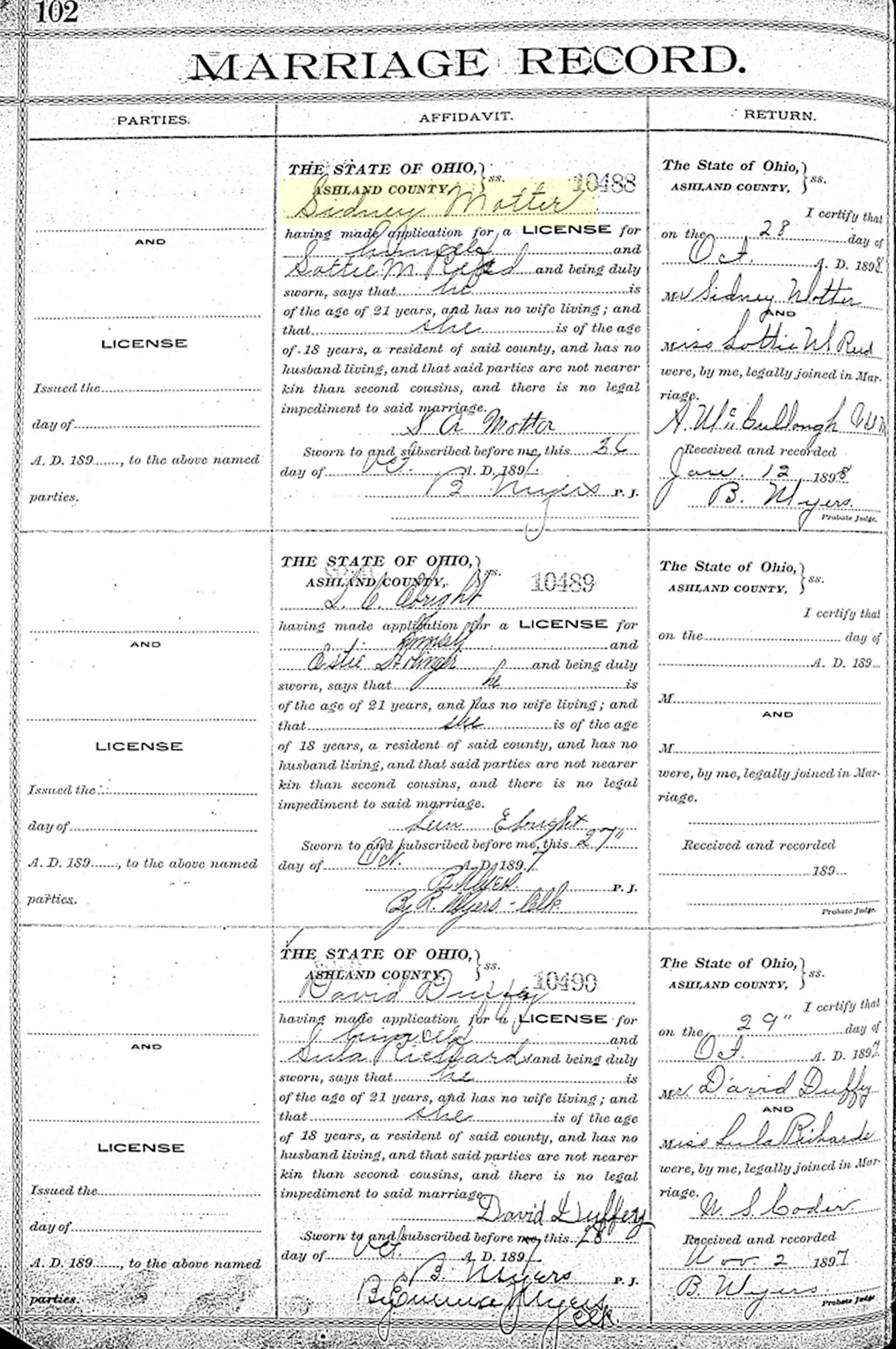 1 "Ohio, County Marriages, 1789-2016," database with images, FamilySearch.org (accessed 19 May 2021); (https://www.familysearch.org/ark:/61903/1:1:Z89Z-663Z : 8 March 2021), Sidney Motter and Lottie M. Reed, 1897.