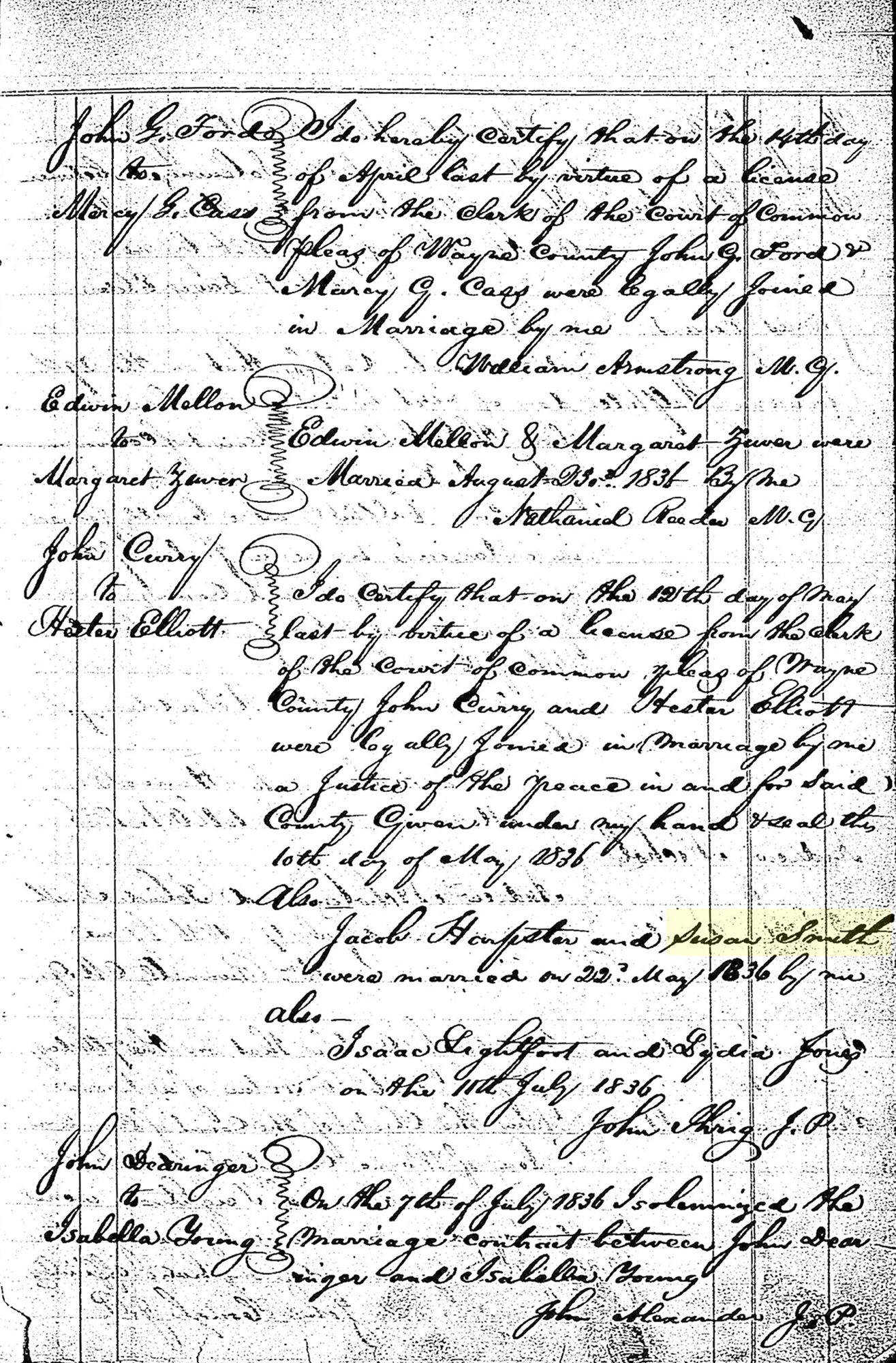State of Ohio, Wayne County. I certify that on the fourteenth day of December last, I joined together in the holy state of matrimony, John Smith and Susana Lightfoot, of lawful age. Given under my hand this first day of February 1821. John Erich, J. Peace ----------------------------------------