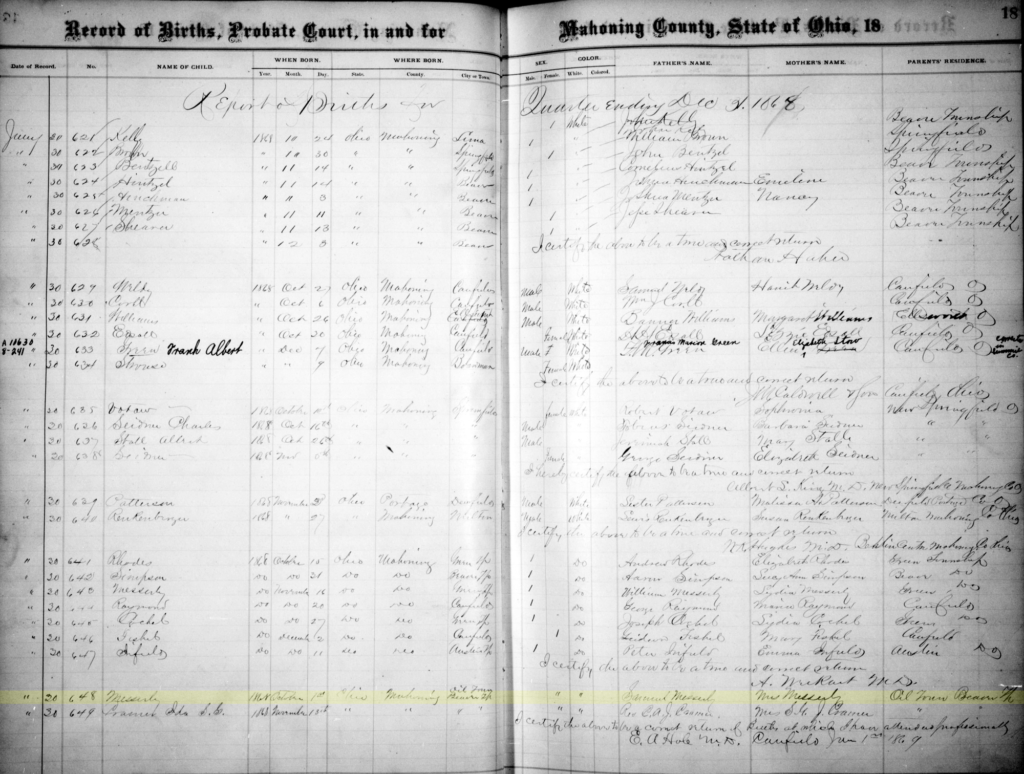 5 "Ohio, County Births, 1841-2003," database with images, FamilySearch (accessed 24 March 2021); (https://www.familysearch.org/ark:/61903/1:1:X69S-W1M : 8 March 2021), Messerly, 1868.