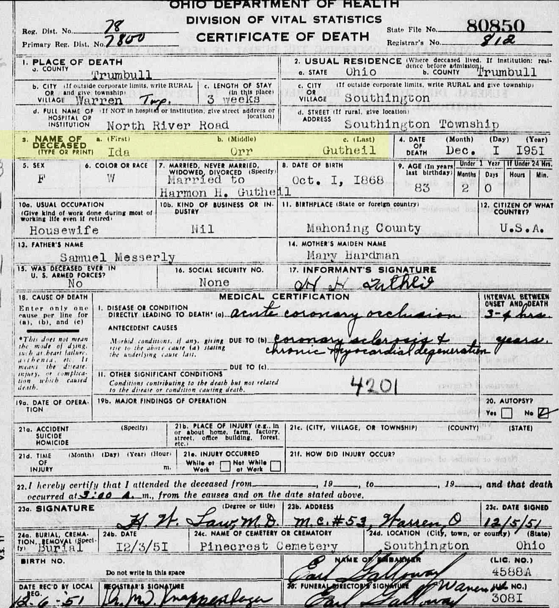 6 "Ohio Deaths, 1908-1953," database with images, FamilySearch.org (accessed 24 March 2021), (https://www.familysearch.org/ark:/61903/1:1:X6P3-17J : 8 March 2021), Ida Orr Gutheil, 01 Dec 1951; citing, reference certificate; FHL microfilm 2,372,880.