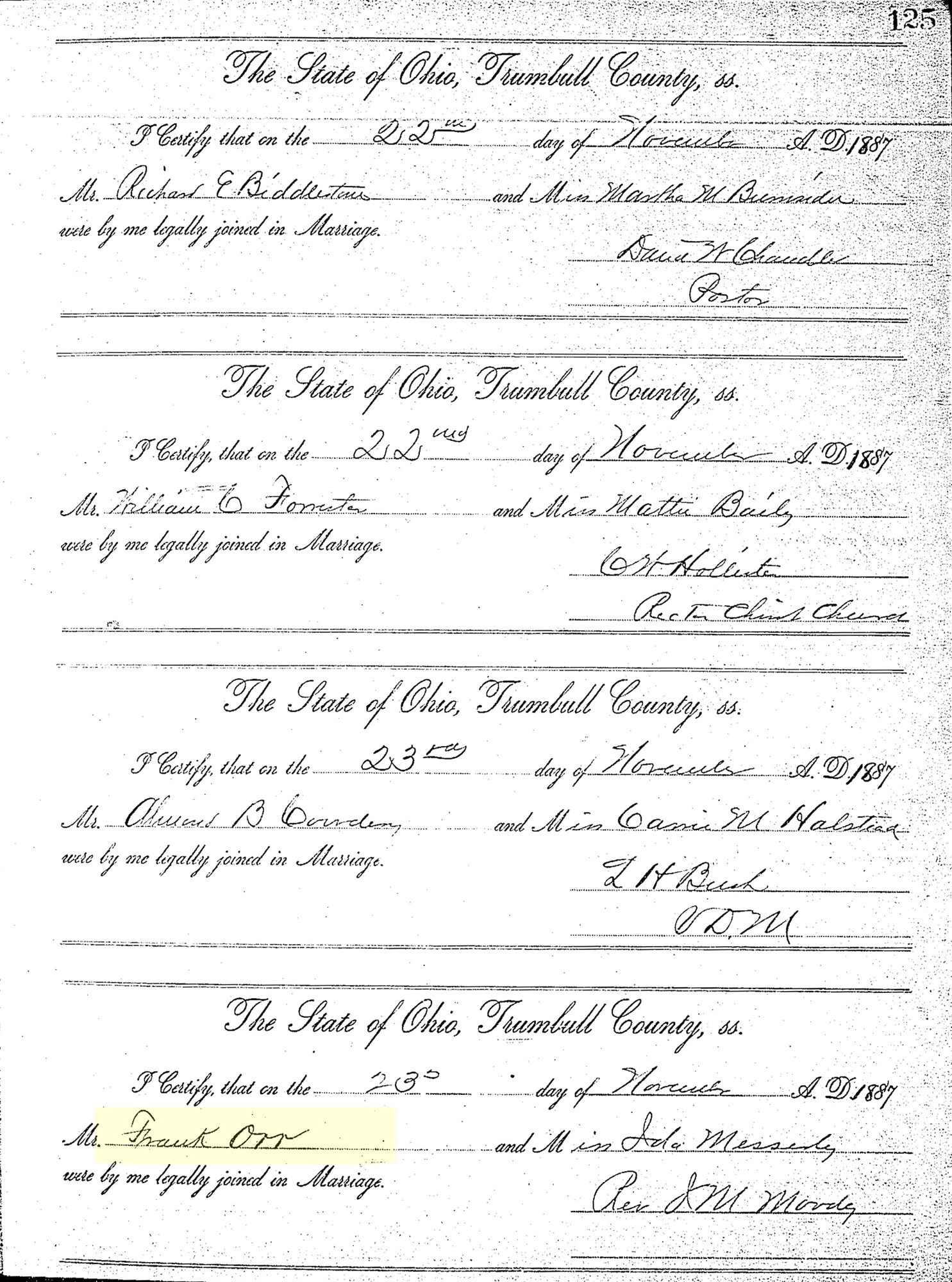 1 "Ohio, County Marriages, 1789-2016," database with images, FamilySearch.org (accessed 23 March 2021); (https://familysearch.org/ark:/61903/1:1:XZNJ-34V : 8 March 2021), Frank Orr and Ida Messerly, 23 Nov 1887; citing Marriage, Trumbull, Ohio, United States, p125, Franklin County Genealogical & Historical Society, Columbus; FHL microfilm.