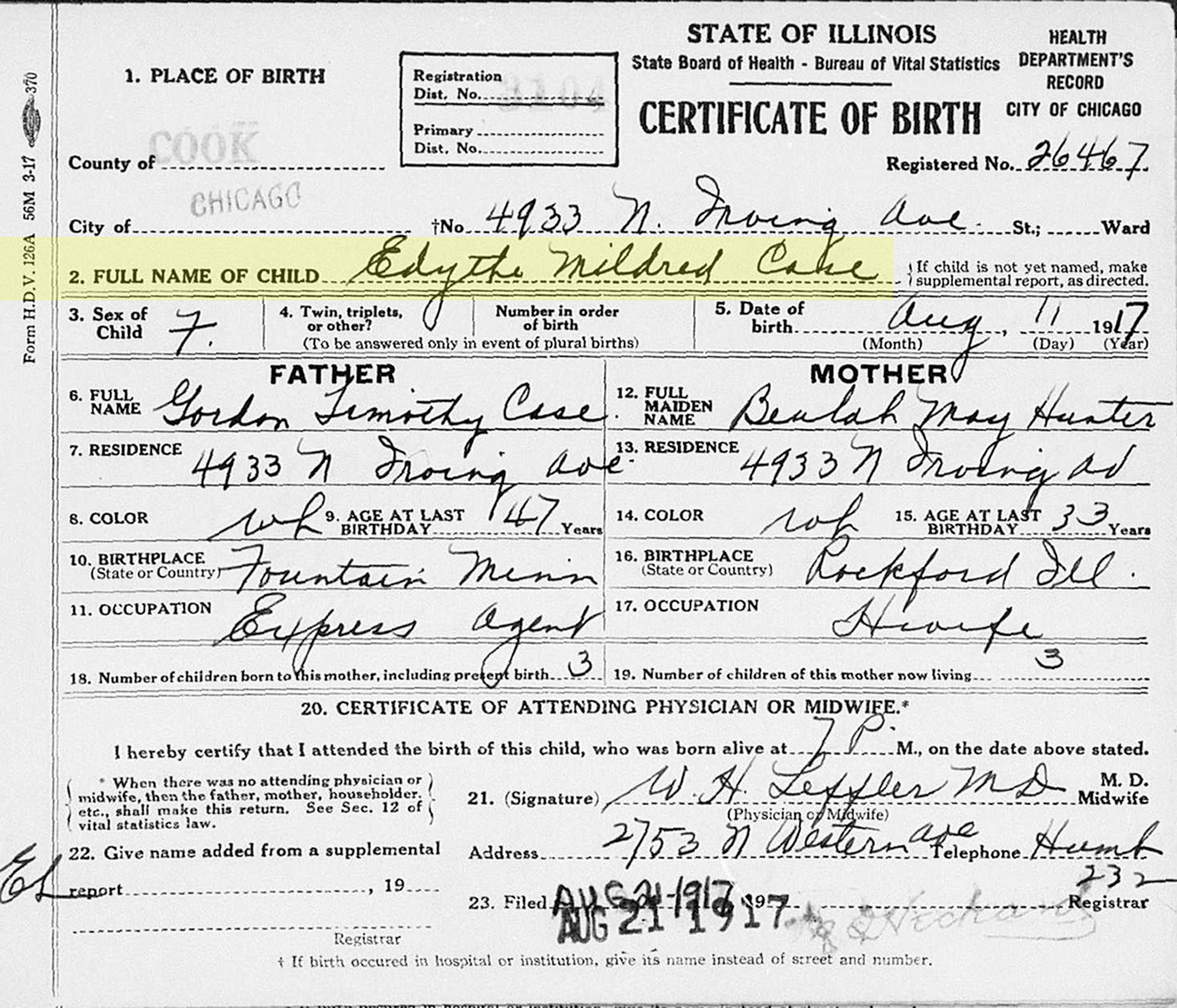 Name: Edythe Mildred Case Birth Date: 11 Aug 1917 Birthplace: Chicago Gender: Female Father's Name: Gordon Timothy Case Father's Birthplace: Fountain, Minnesota Father's Age: 47 Mother's Name: Beulah May Hunter Mother's Birthplace: Rockford, Illinois Mother's Age: 33 Film Number: 1276324 Digital Folder Number: 4402456 Image Number: 01033 Reference Number: 26467