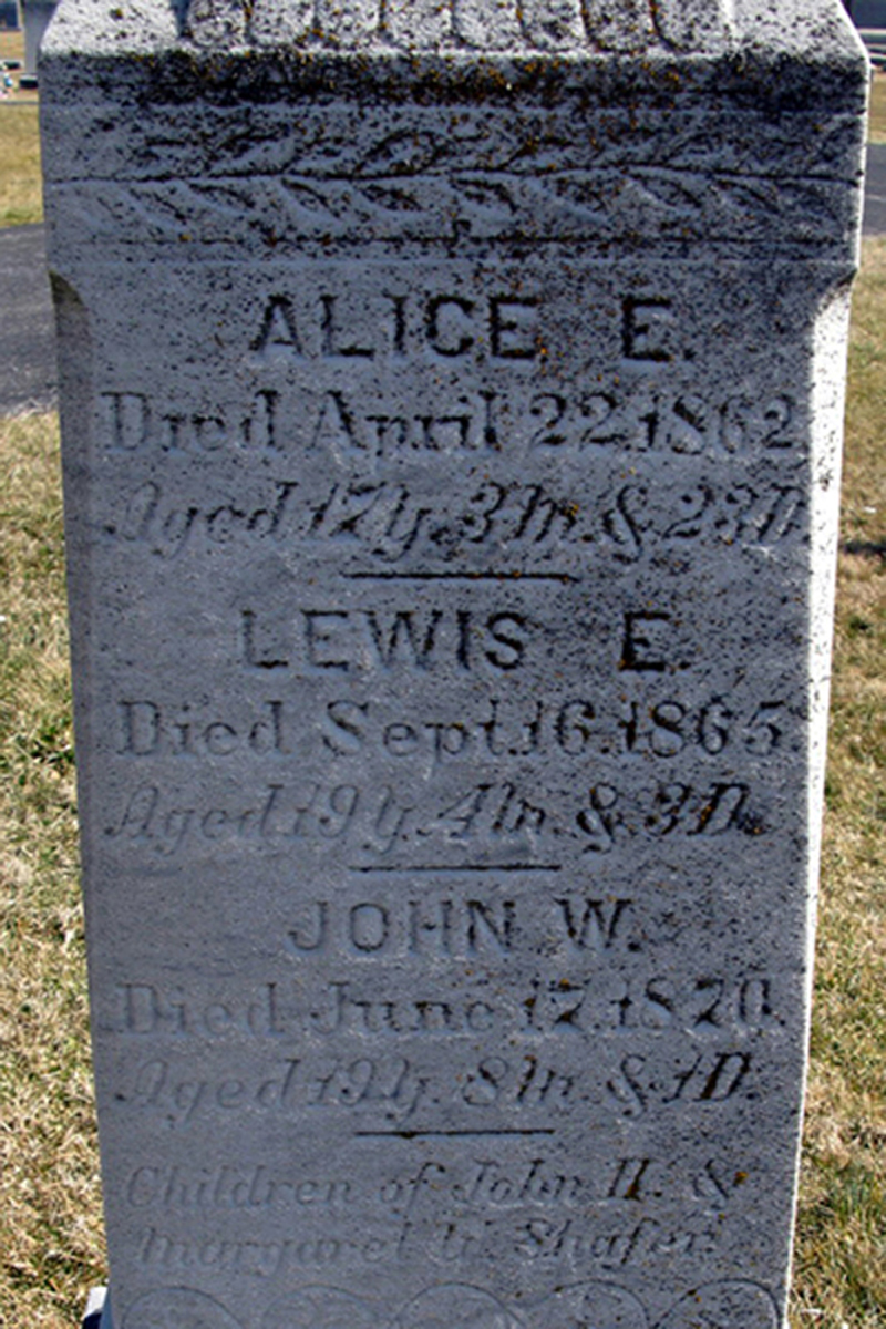 Find A Grave, database and images (https://www.findagrave.com/ ); accessed 9 April 2019), memorial page for Lewis E. Shafer (unknown\endash 16 Sep 1865), Find A Grave Memorial no. 106274227, citing Christ Reformed Cemetery, Middletown, Frederick County, Maryland, USA