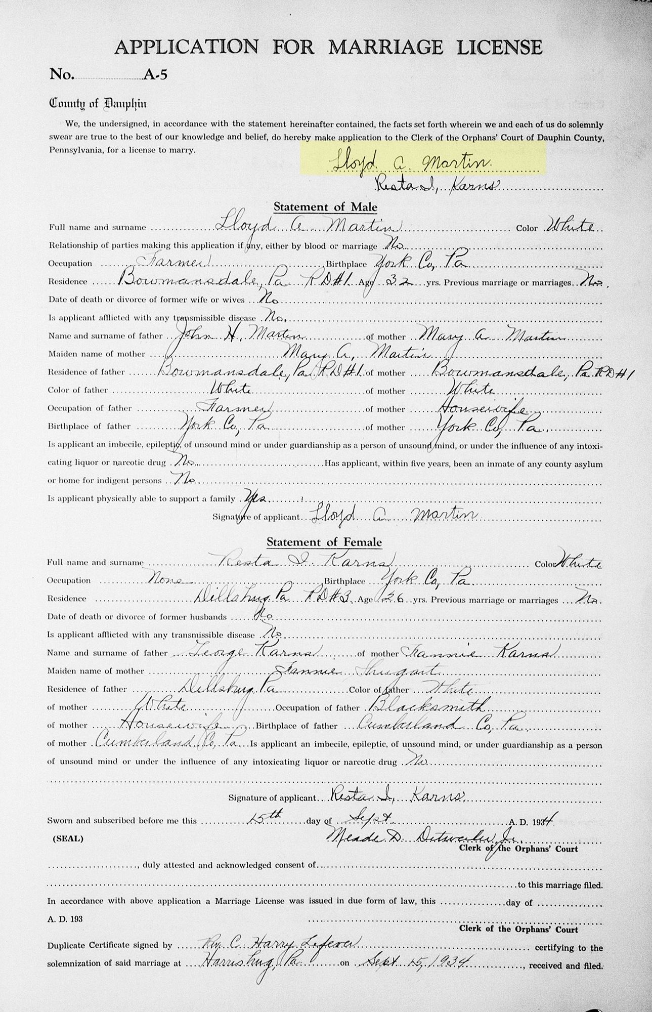 1 "Pennsylvania, County Marriages, 1885-1950," database with images, FamilySearch (accessed 4 Aug 2019); Lloyd A. Martin and Resta I. Karns, 15 Sep 1934; citing Marriage, Dauphin, Pennsylvania, United States, various county courts and registers, Pennslyvannia; FHL microfilm 21,210.
