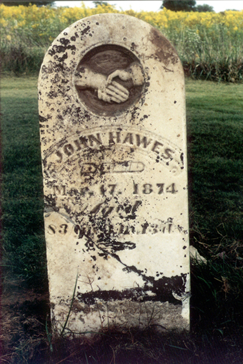 The gravestone for John is a white sandstone domed tablet that has weathered quite badly. It has been broken into at least three pieces of which have been repaired and glued back together as of September 2002. Perhaps the broken fragments were buried face down which may have kept the engraving from weathering any more. The inscription reads "John Hawes, Died Mar. 17, 1874, Aged 83y 3m 13d".