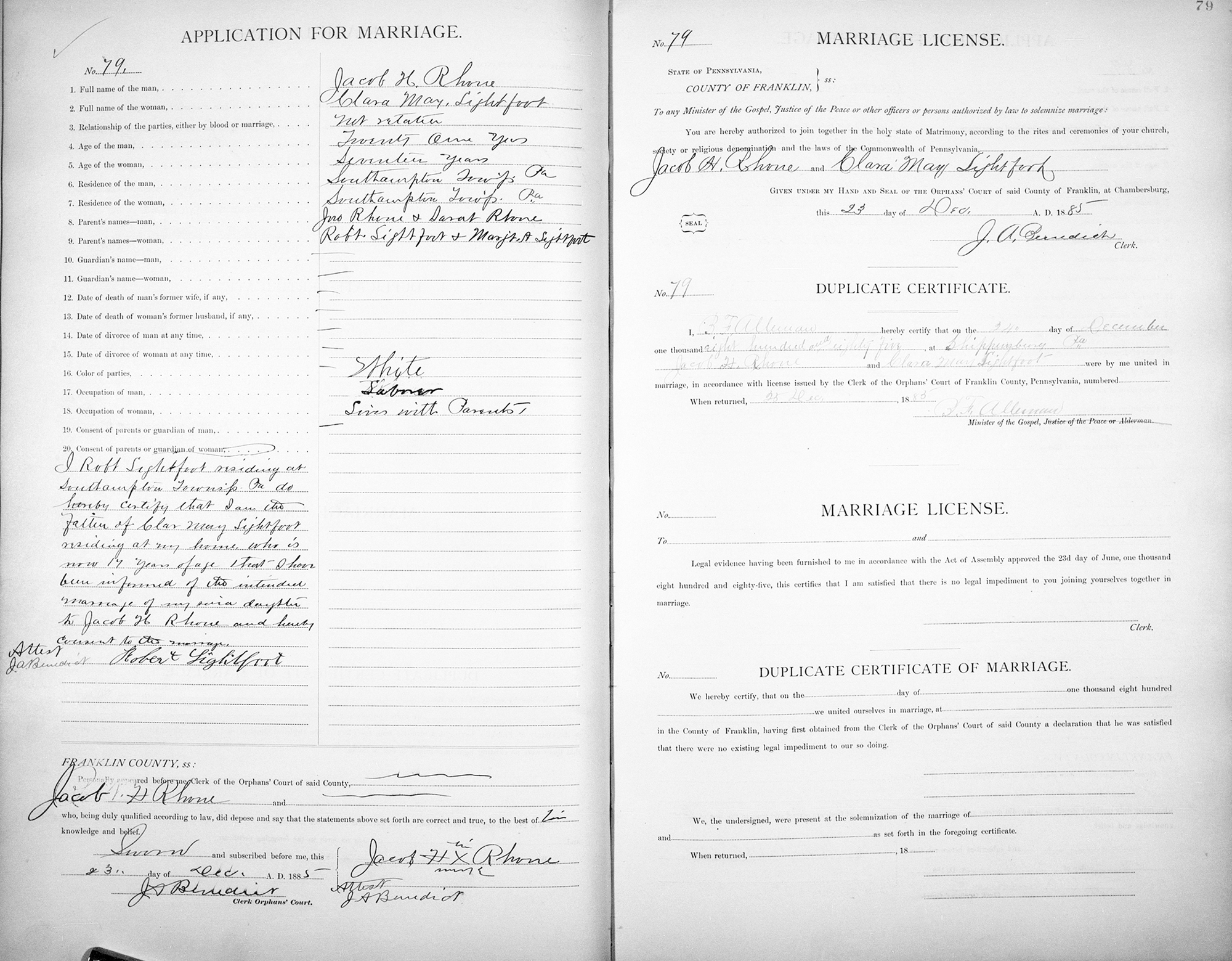 2 "Pennsylvania, County Marriages, 1885-1950," database with images, FamilySearch (accessed 20 August 2020); Jacob H Rhone and Clara May Lightfoot, 24 Dec 1885; citing Marriage, Franklin, Pennsylvania, United States, multiple County Clerks, Pennsylvania.