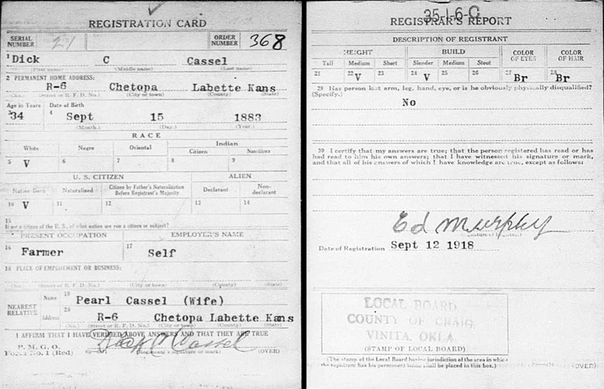 6 "United States World War I Draft Registration Cards, 1917-1918," database with images, FamilySearch.org (accessed 20 Nov 2013); Name: Dick C Cassel; Event Place: Craig County, Oklahoma.