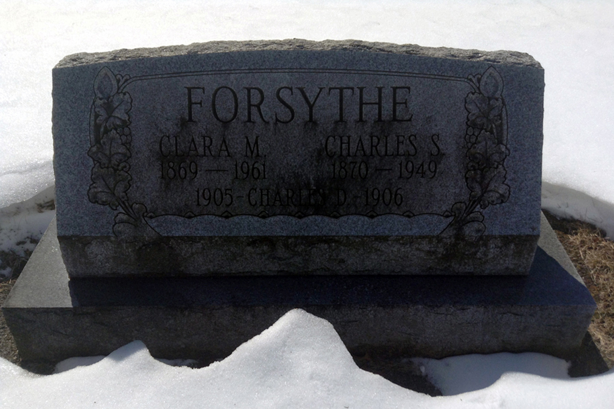 2 "Pennsylvania, County Marriages, 1885-1950," database with images, FamilySearch (accessed 27 Oct 2013); Name: Charles S. Forsythe; Spouse's Name: Clara M. Rhone; Event Date: 24 Feb 1903; Event Place: Shippensburg, Cumberland, Pennsylvania.