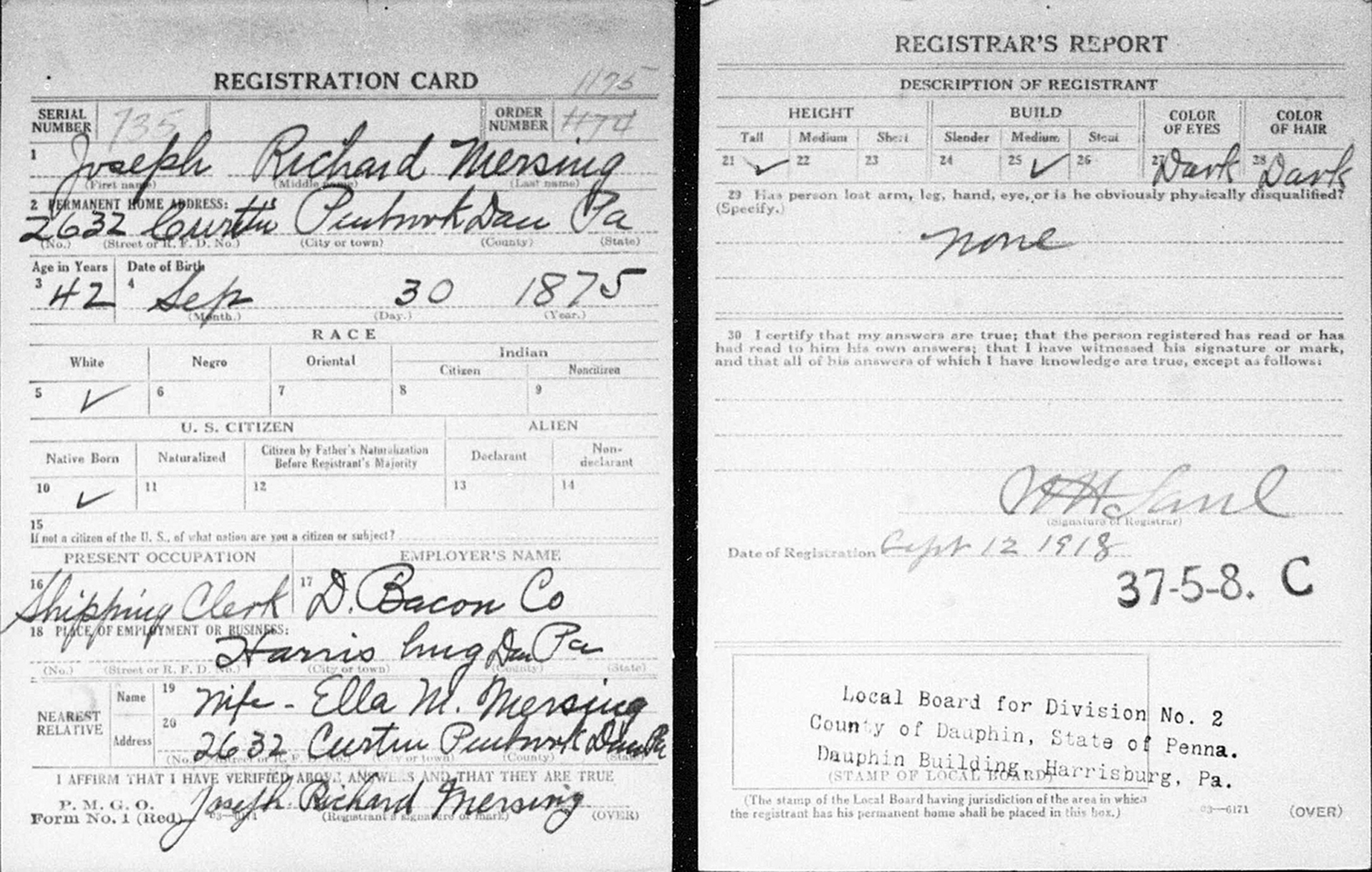 • He appeared on the 1910 US Census in Harrisburg, PA on 5 May 1910. 2 • His occupation in September 1918 was a Shipping Clerk for D. Bacon Company in Harrisburg, PA. 6 • He resided at 2632 Curtin on 12 September 1918 in Penbrook, PA.