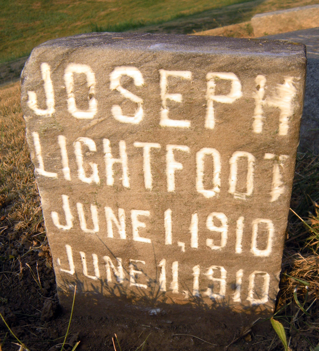 Find A Grave, database and images (https://www.findagrave.com/ ); accessed 05 December 2021, memorial page for Joseph E Lightfoot (4 Jun 1910-12 Jun 1910), Find a Grave Memorial ID 93577174, citing Mound Grove Cemetery, Independence, Jackson County, Missouri, USA